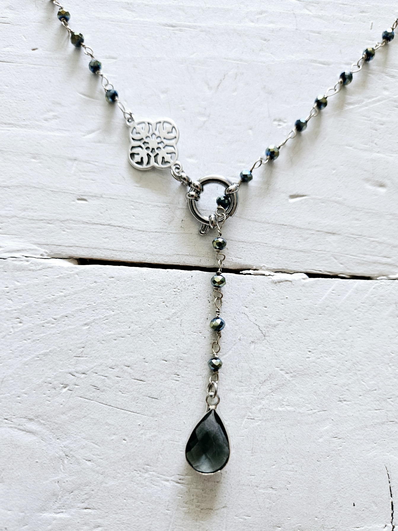 Collar rosario con piedras de cristal en tono irisado, lágrima de piedra a tono, y broche de acero.