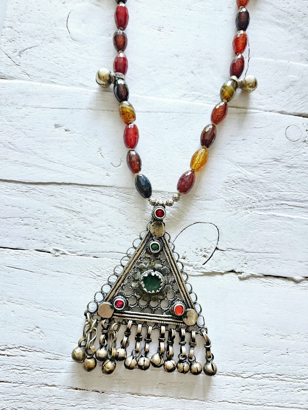 Collar largo de ágatas facetadas multicolor, con gran colgante antiguo afgano. Tamaño de la pieza 7cm.aprox.Pieza única