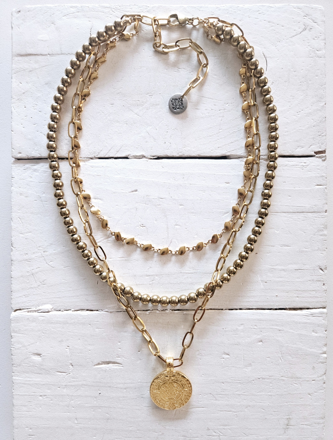 Gargantilla triple de hematites, cadenas de acero con baño de oro 24k. y colgante moneda también con baño de oro de 24k, largo ajustable. Tamaño aprox moneda 2,5cm