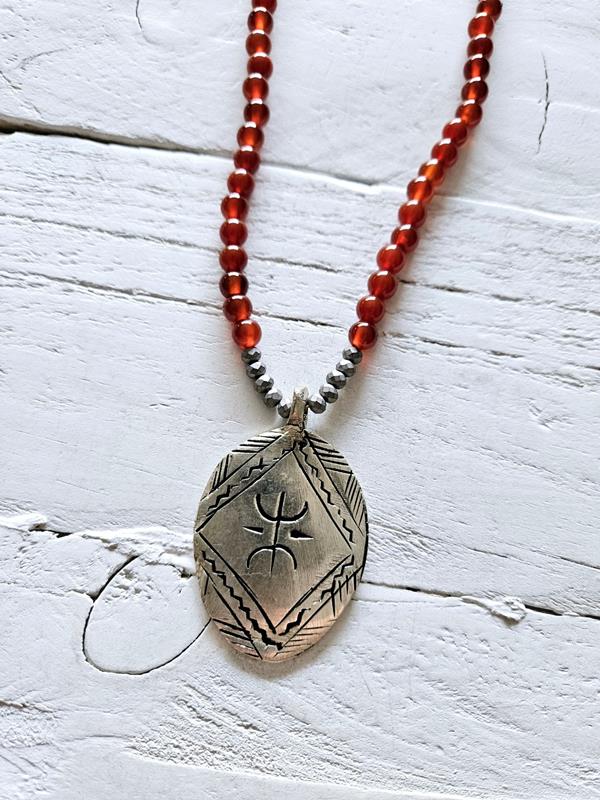 PRE-ORDER entrega 5 días. Collar de cornalinas con colgante tipo medallón hecho a mano por artesanos bereberes. Cierre en forma de T para posibilidad de dos vueltas. Tamaño de la pieza 3,5cm. aprox. Tamaño de las piedras 6mm.
