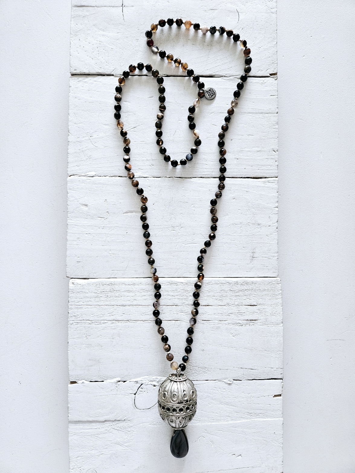Collar de ágatas facetadas pasadas nudo a nudo en colores marrones y negros, con colgante bola bereber y colgante mineral. Tamaño aprox de la bola 3cm.