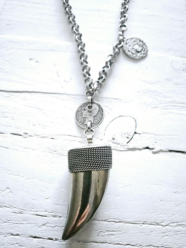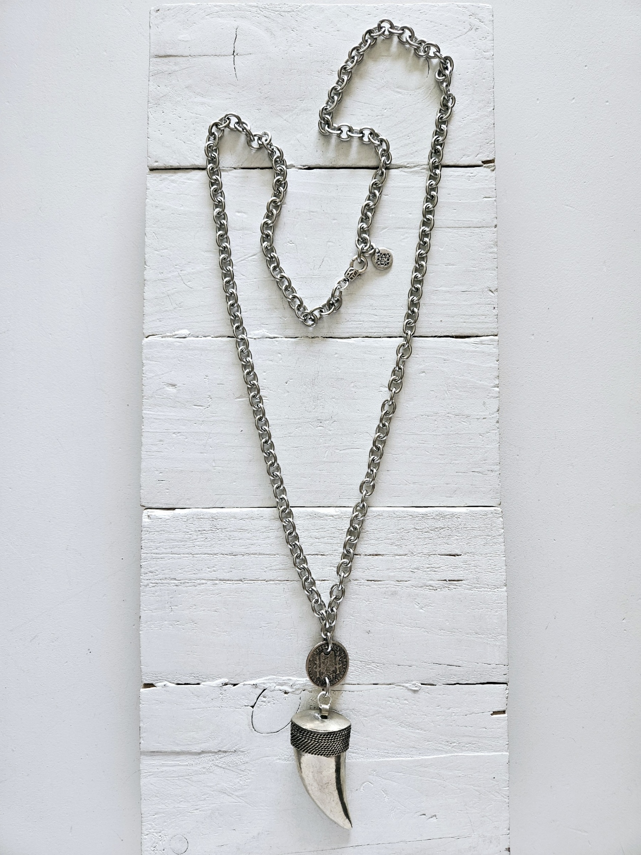 Cadena de eslabones en acero, con colmillo de latón hecho a mano por artesanos bereberes. Tamaño del colmillo 7 cm. Largo de cadena ajustable.