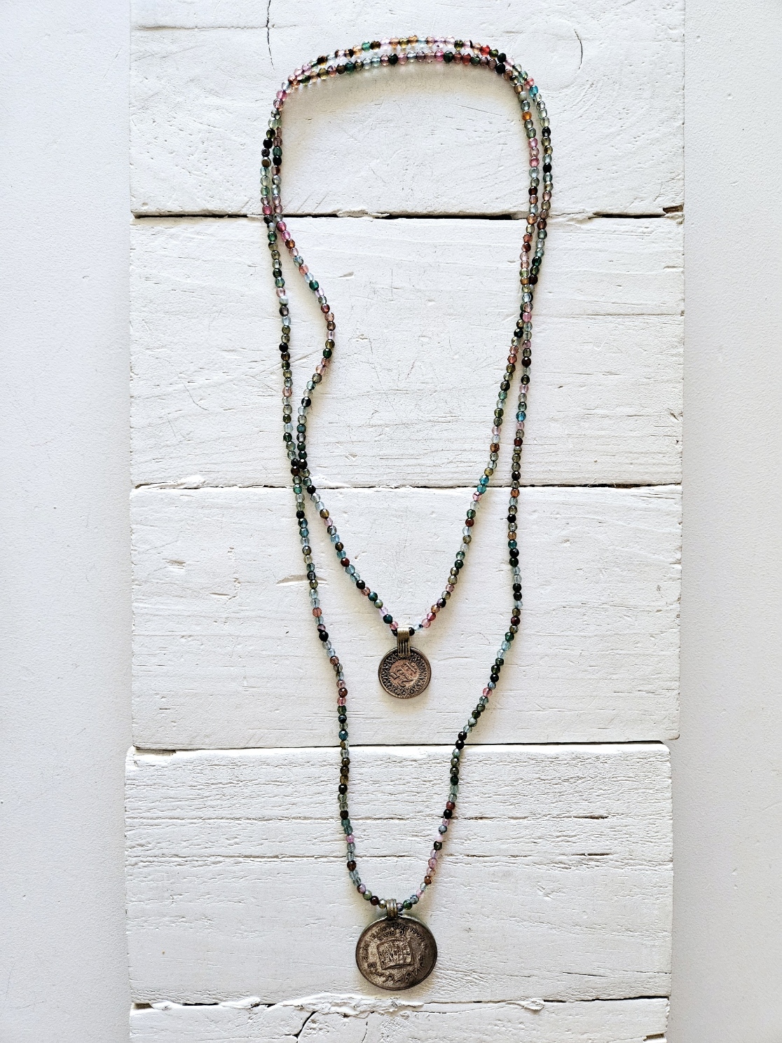 Collar de pequeños cristales facetados multicolor en tonos agua y rosados, de doble vuelta y con dos monedas de plata afgana. Multiposición