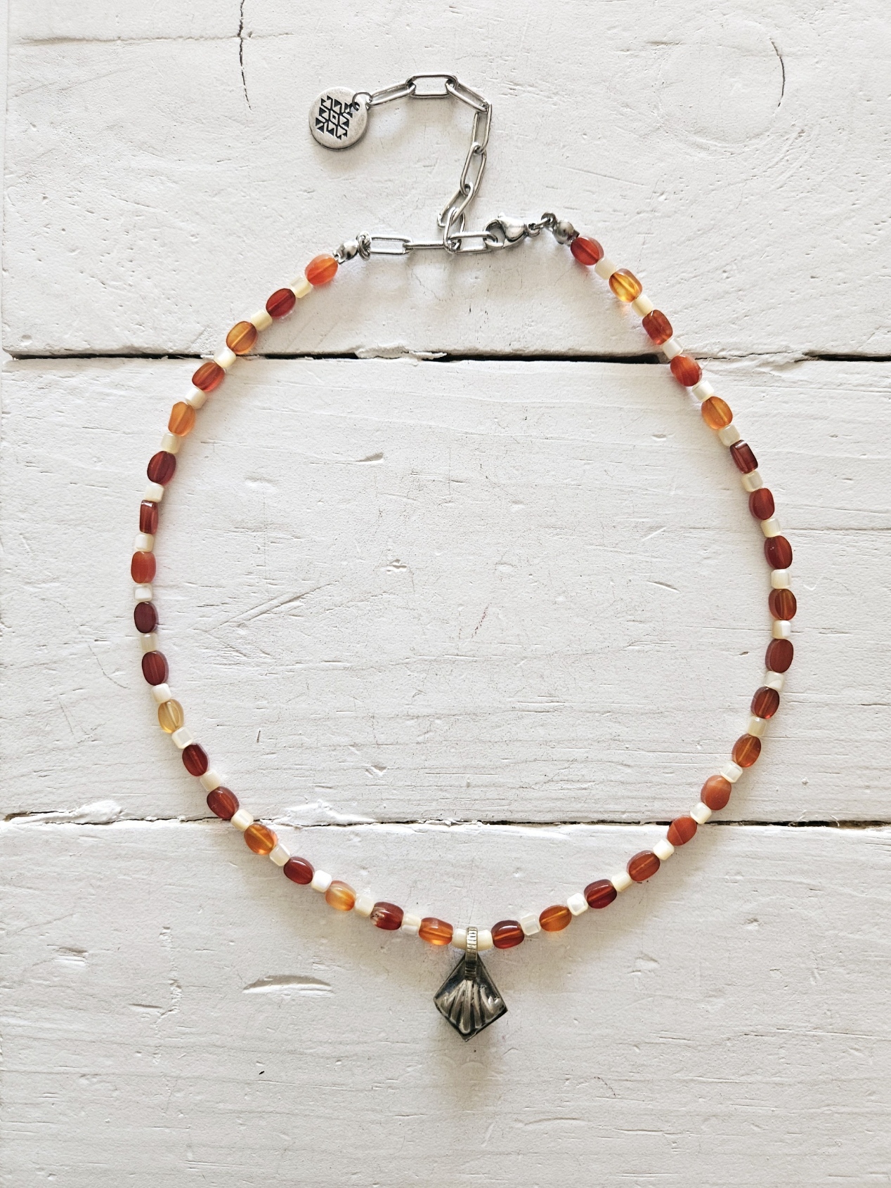 Gargantilla de pequeñas cornalinas de talla ovalada intercaladas con nácar y pequeño colgante antiguo afgano. Largo ajustable