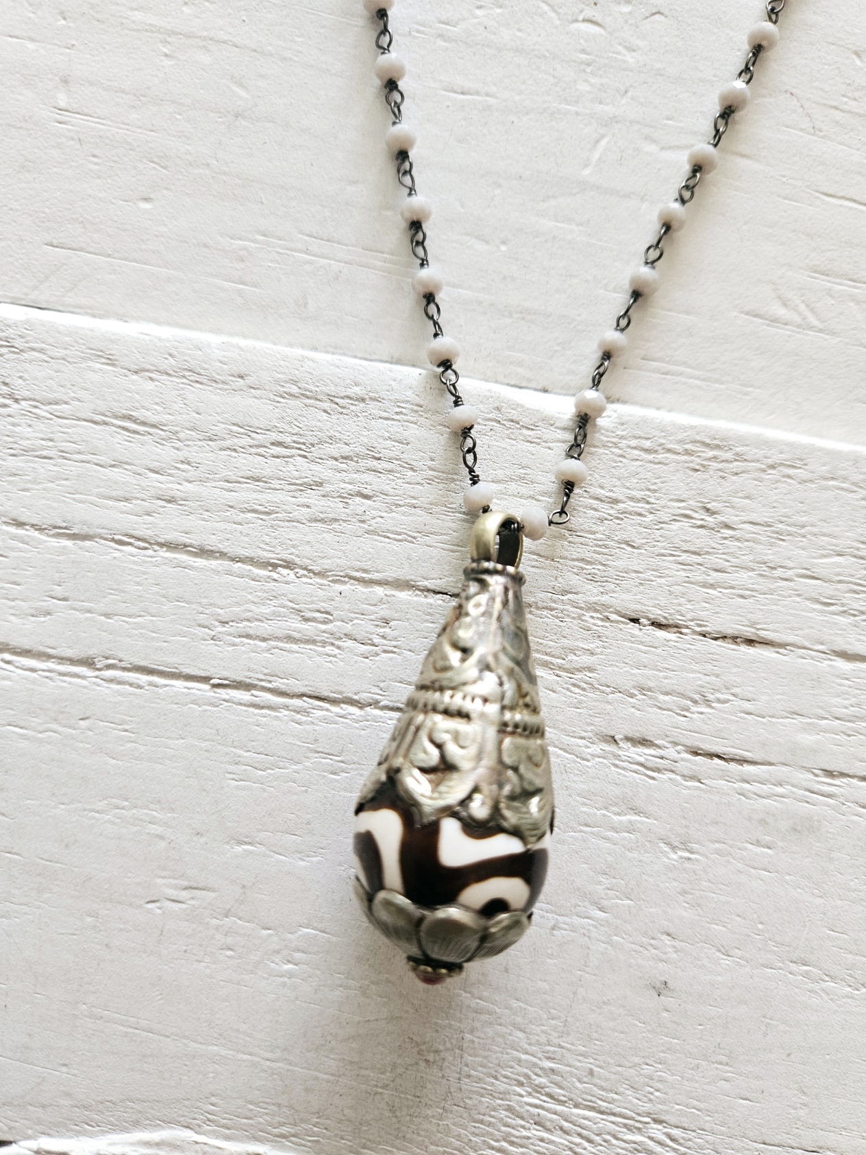 Colgante con cadena tipo rosario en color tiza, colgante de péndulo tibetano auténtico. Tamaño del colgante 4cm aprox.