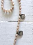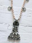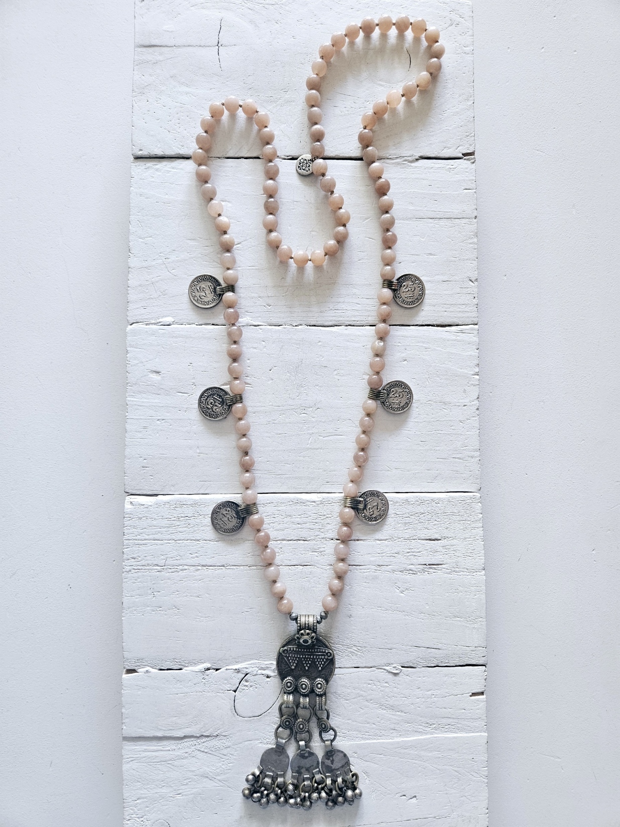 PREORDER- entrega de 5 días a 7 días! Muy pocas unidades. Collar de piedras naturales de piedra luna pasadas nudo a nudo con monedas y pieza antigua de plata afgana. Hecho a mano. Tamaño de las piedras 8mm. Tamaño de la pieza 9cm. aprox.