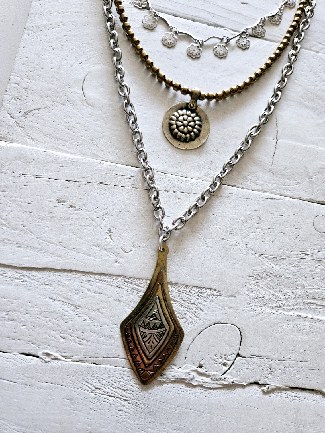 Gargantilla triple de hematites dorados, cadenas de acero, colgante antiguo afgano y colgante con forma de lágrima de latón hecho por artesanos bereber con mix de tonos en plateado y dorado. Tamaño lágrima 3cm aprox. largo ajustable.