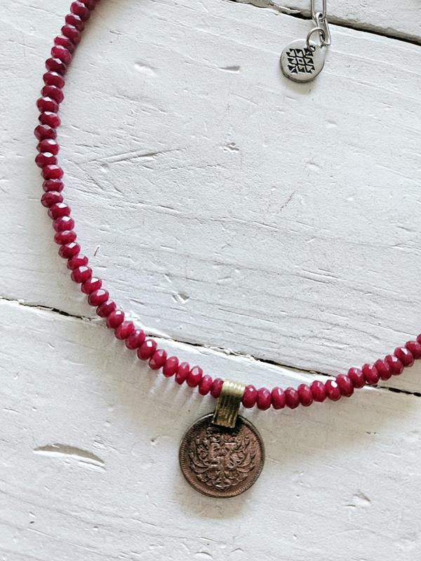 Gargantilla de piedras facetadas color borgoña y colgante de moneda antigua afgana, medida ajustable con extensor.
