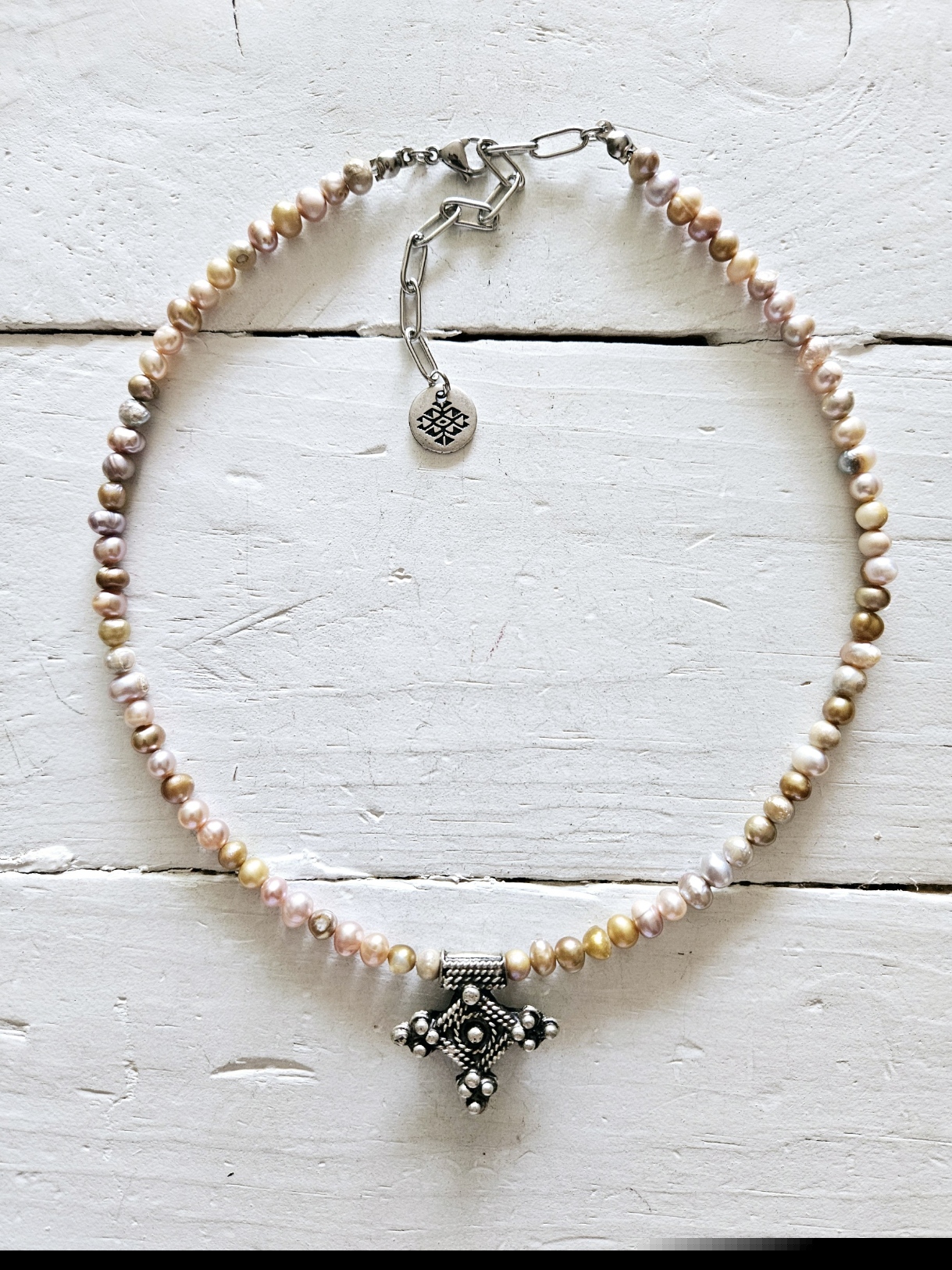 Gargantilla de perlas naturales de río, irregulares con reflejos dorados y rosados con colgante de cruz auténtica bereber, hecha a mano por artesanos bereberes. Tamaño de la cruz 2cm. aprox. Medida ajustable.