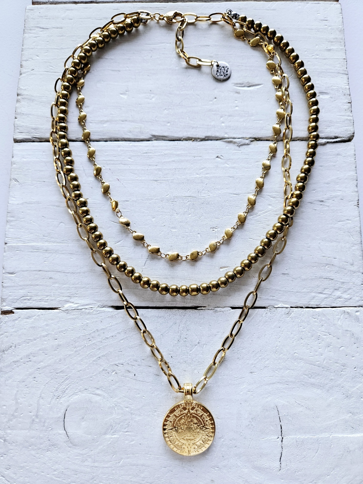 Gargantilla triple de hematites, cadenas de acero con baño de oro 24k. y colgante moneda, largo ajustable.