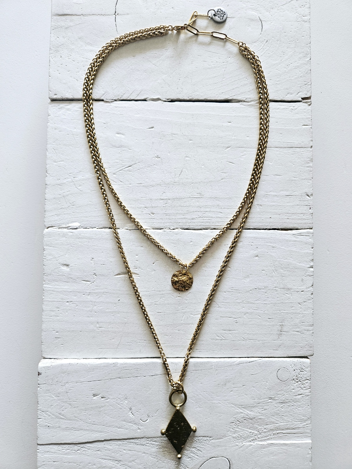 Gargantilla doble con cadena tipo cordón de acero, pequeño colgante de latón y colgante bereber en latón dorado. Largo ajustable con extensor.