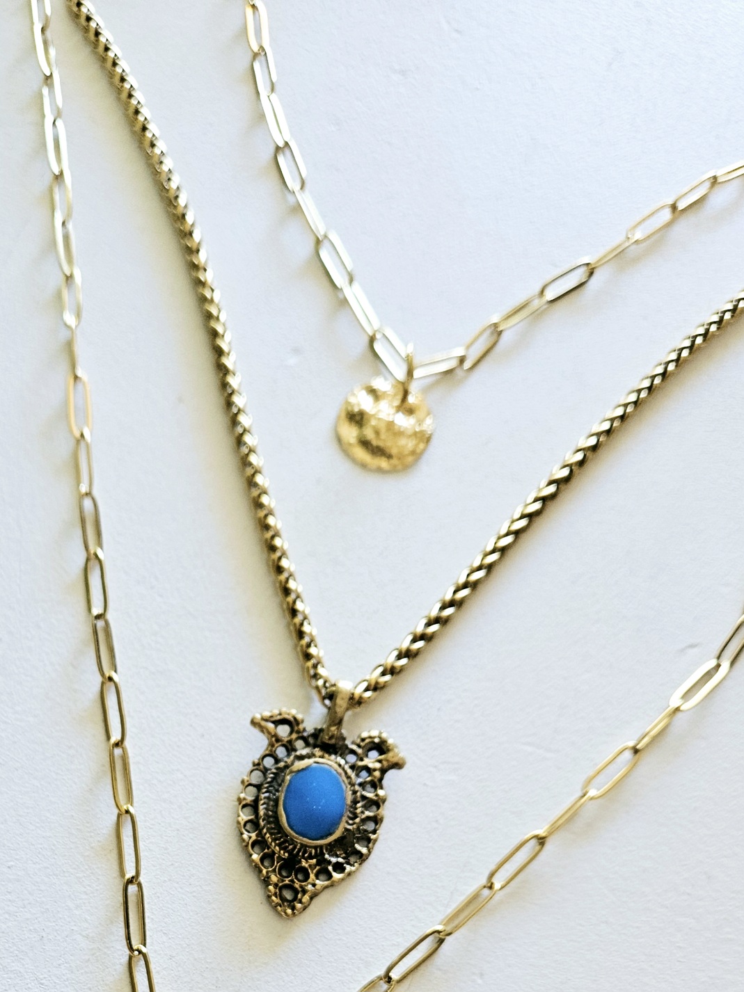Gargantilla doble con cadena tipo cordón de acero y eslabones con baño de oro, pequeño colgante de latón y colgante afgano antiguo con esmalte en turguesa. Largo ajustable con extensor.