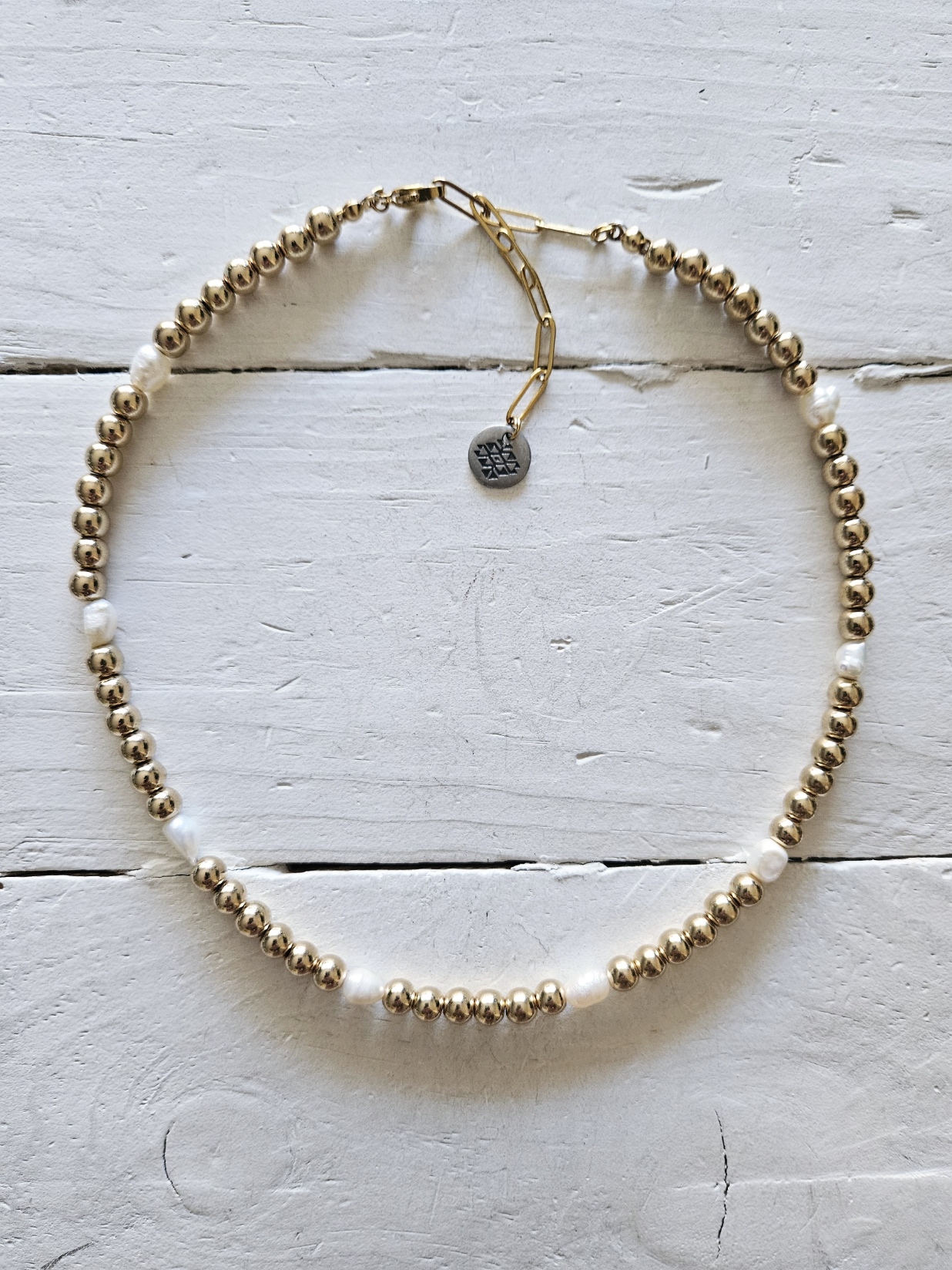Choker de hematites con perlas naturales de río y baño dorado. Medida ajustable con extensor de 5 cm.