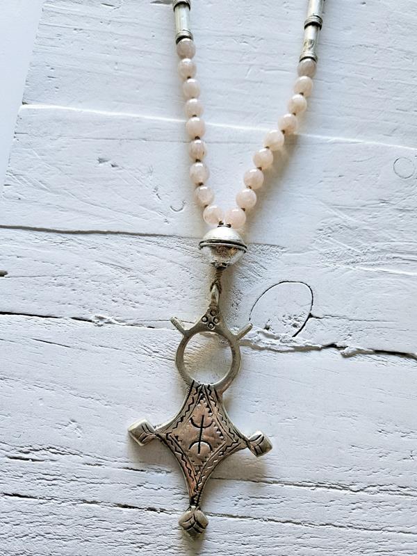 Collar largo de piedras naturales de sol en tono rosado, pasado nudo a nudo con cruz tuareg y entrepiezas artesanales. Tamaño de la pieza 6cm.aprox. Tamaño de cuentas 8mm