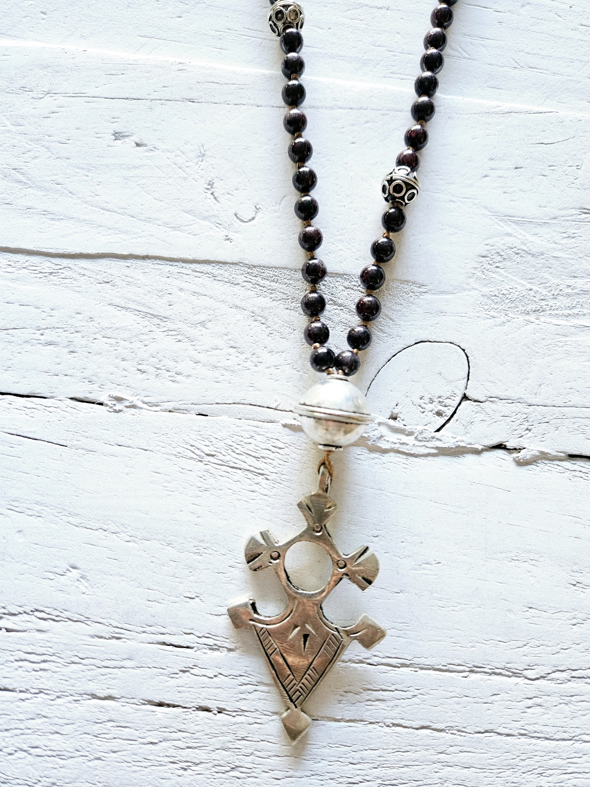 Granates de 4 mm. pasados nudo a nudo con entrepiezas y auténtica cruz tuareg hecha a mano por artesanos bereberes , no existen dos cruces iguales, cada una es diferente. Tamaño aprox.de la cruz 6- 7cm
