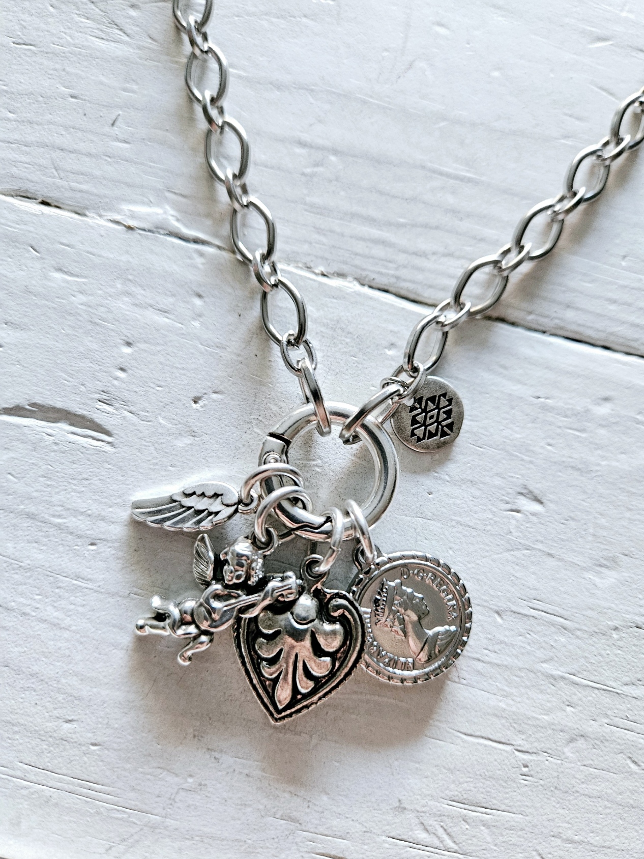 Gargantilla de cadena de eslabones de acero, cierre tipo mosquetón de aro y diferentes charms con mucho amor. El broche de aro permite diferentes posiciones y jugar con los charms.