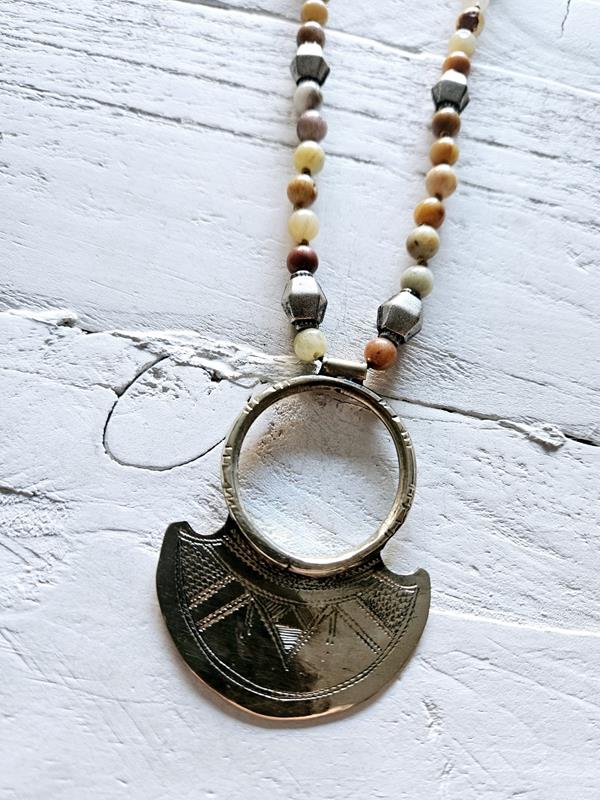 Collar de piedras naturales en tonalidades terracotas, pasadas nudo a nudo entrepiezas vintage de India y colgante aunténtico de amuleto tuareg. Tamaño de la pieza 6cm. Tamaño piedras 0,6mm