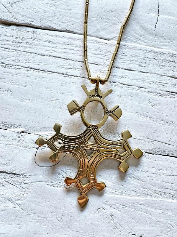 Colgante de cruz tuareg en latón doraddo, tamaño cruz 4cm. aprox.