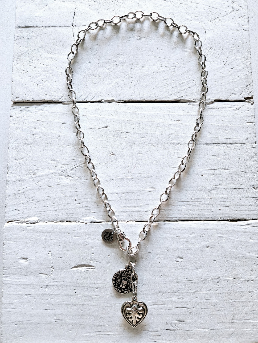 Cadena de eslabones de acero con baño de plata y colgante de corazón y moneda, cierre mosquetón delantero. Multiposición.