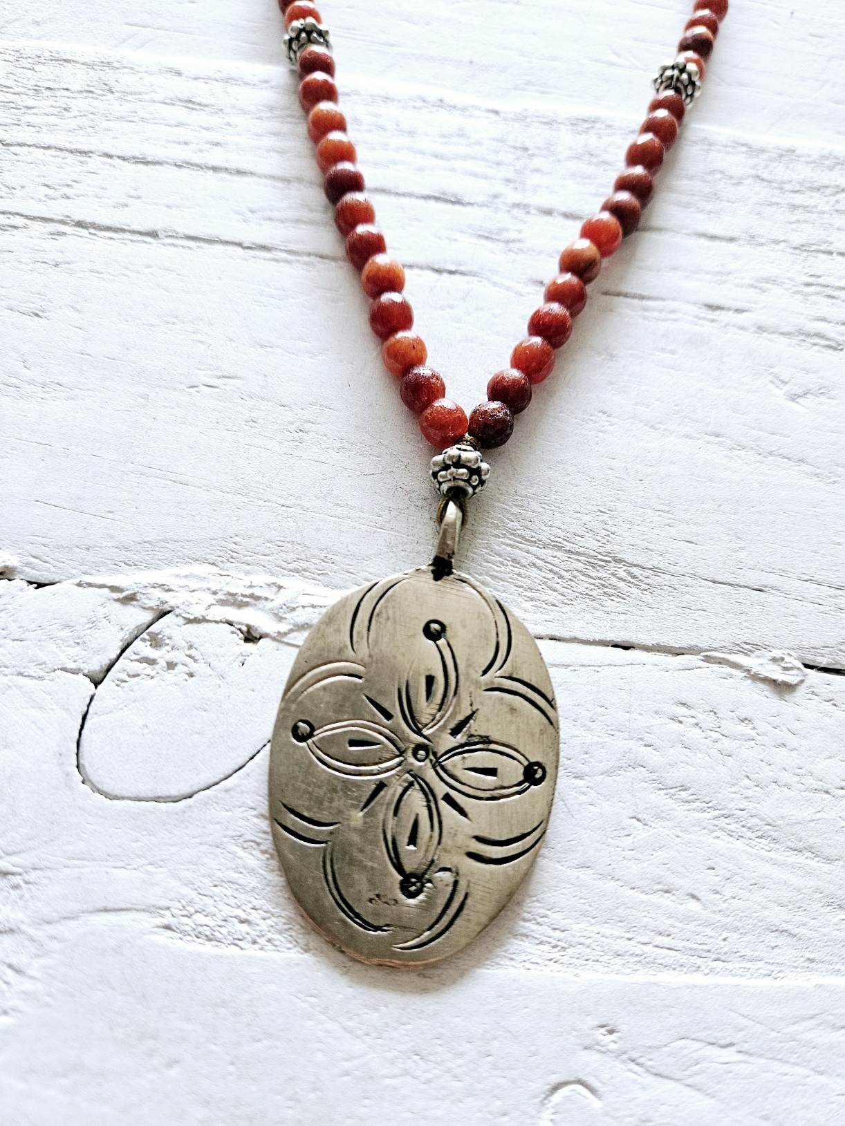Collar de piedras color coral, con colgante tipo medallón hecho a mano por artesanos berebere, no hay dos con el mismo dibujo. Tamaño de la pieza 3,5cm. aprox. Tamaño de las piedras 6mm.