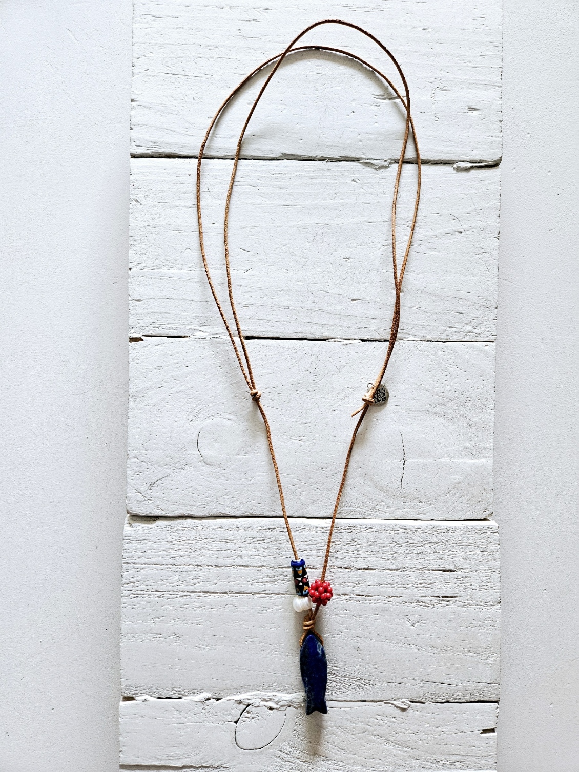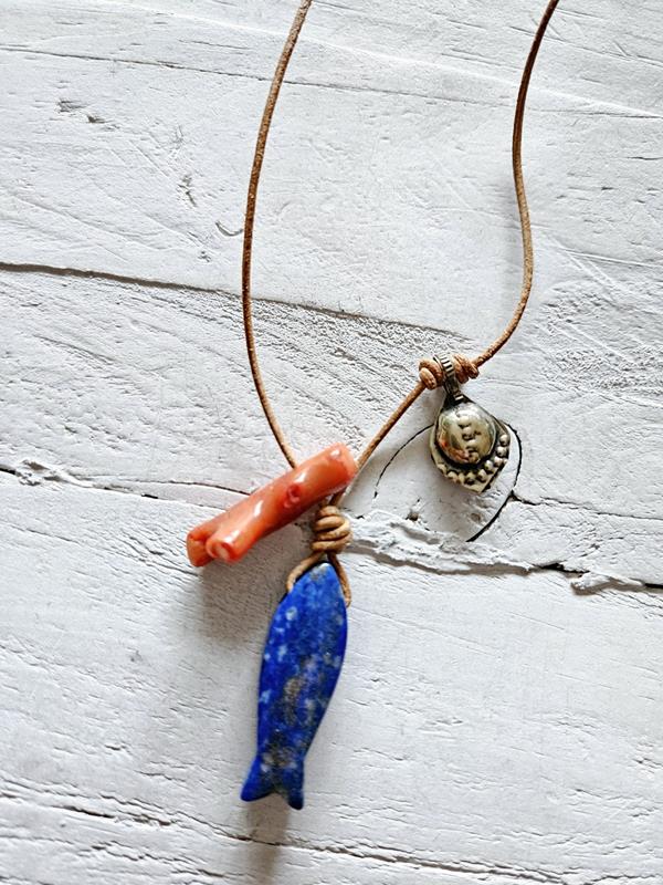 Colgante de pez en lapislázuli y coral con tira de cuero y largo ajustable, tamaño del pez 3,5cm.