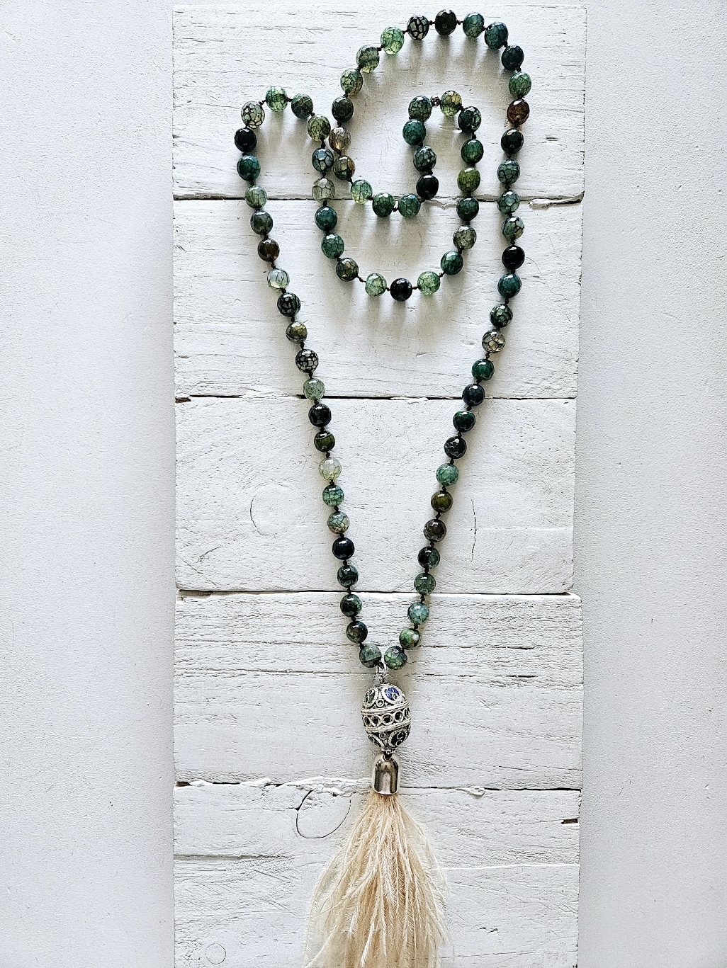 Collar de ágatas facetadas en tonalidades verdes, con pieza artesanal bereber y plumas de avestruz. Montado artesanalmente nudo a nudo.