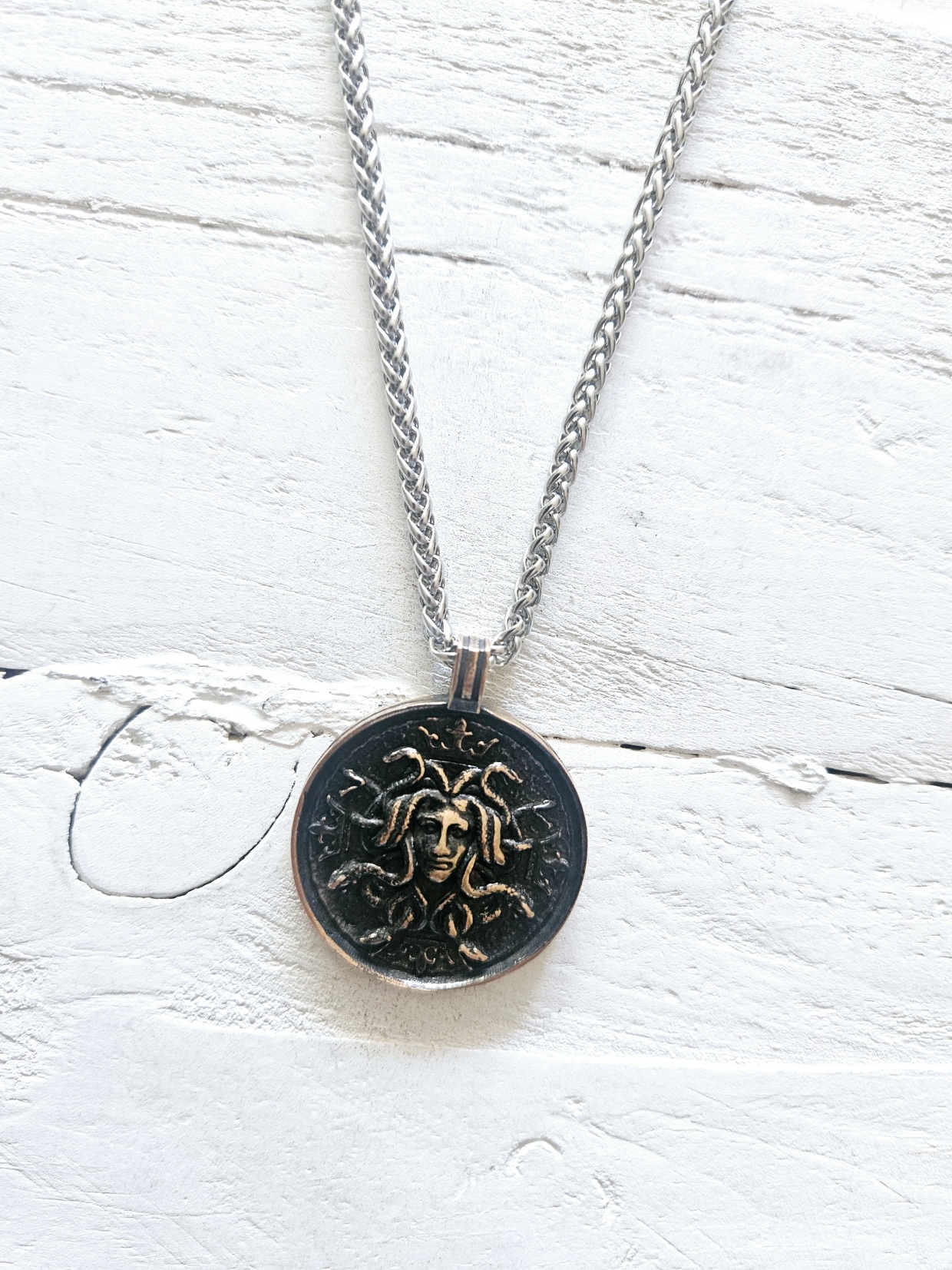Cadena tipo cordón de acero con colgante de moneda en bronce.