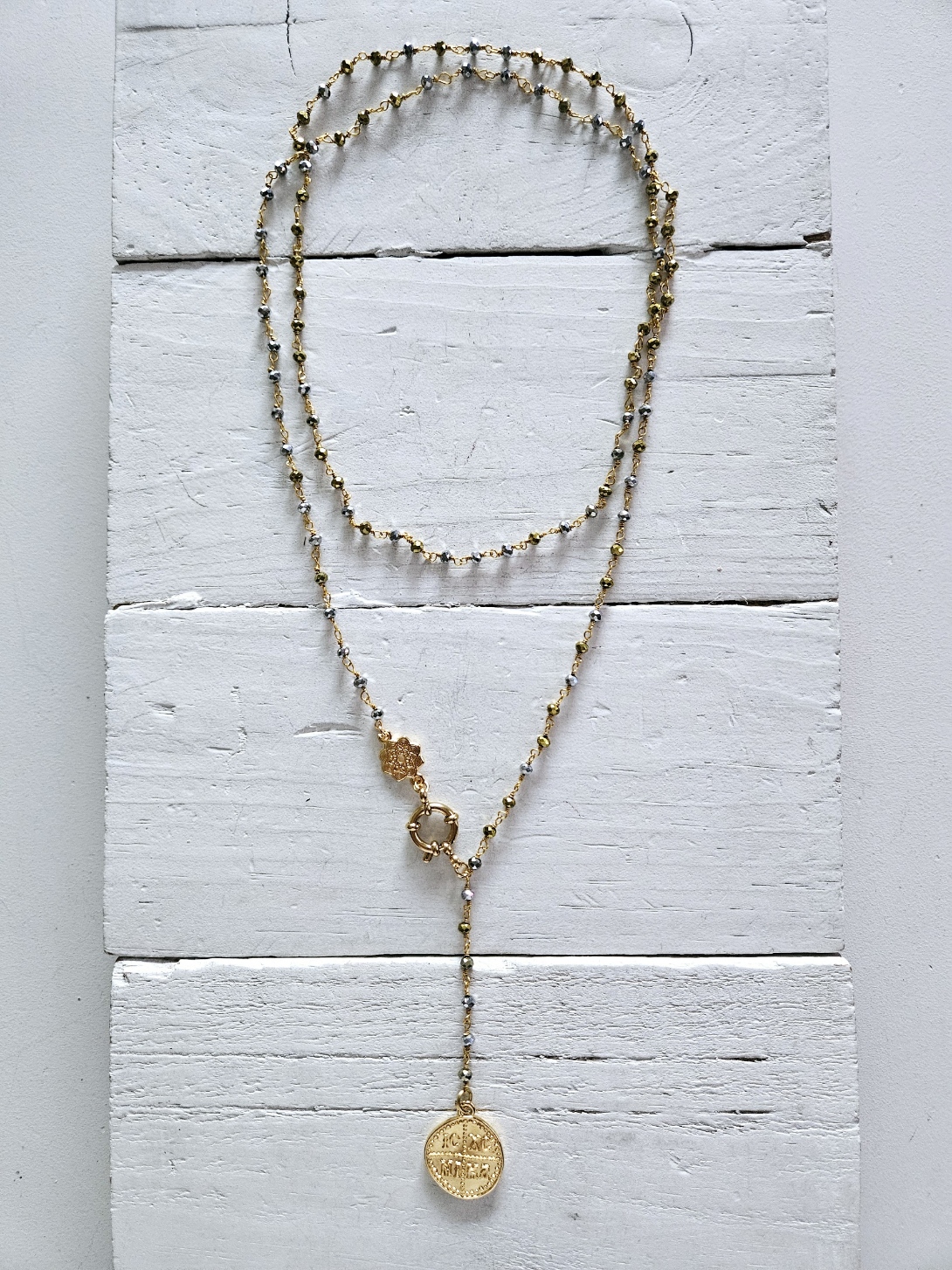 Collar tipo rosario largo con piedras de cristal facetado en tono irisado engarzadas en dorado, colgante de moneda romana y broche de acero. Posibilidad con doble vuelta.
