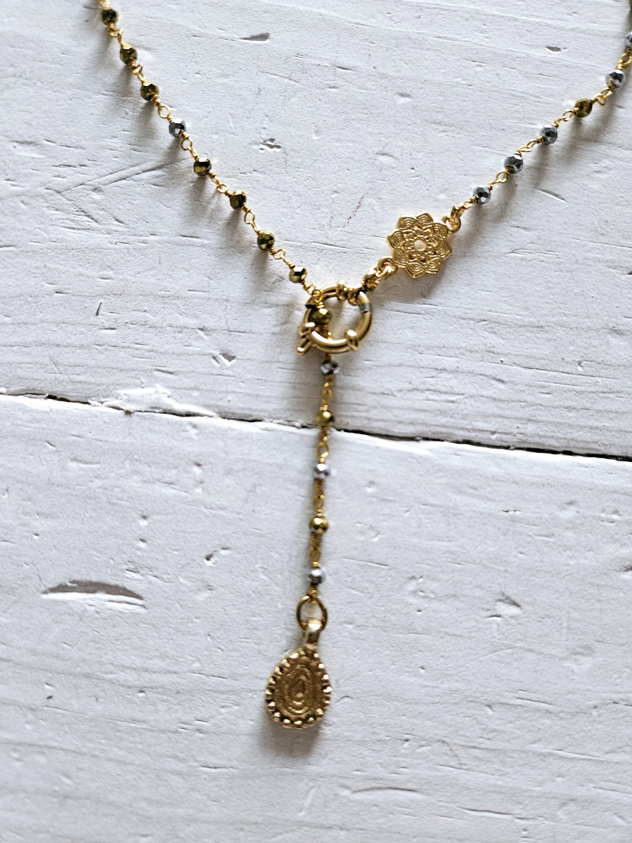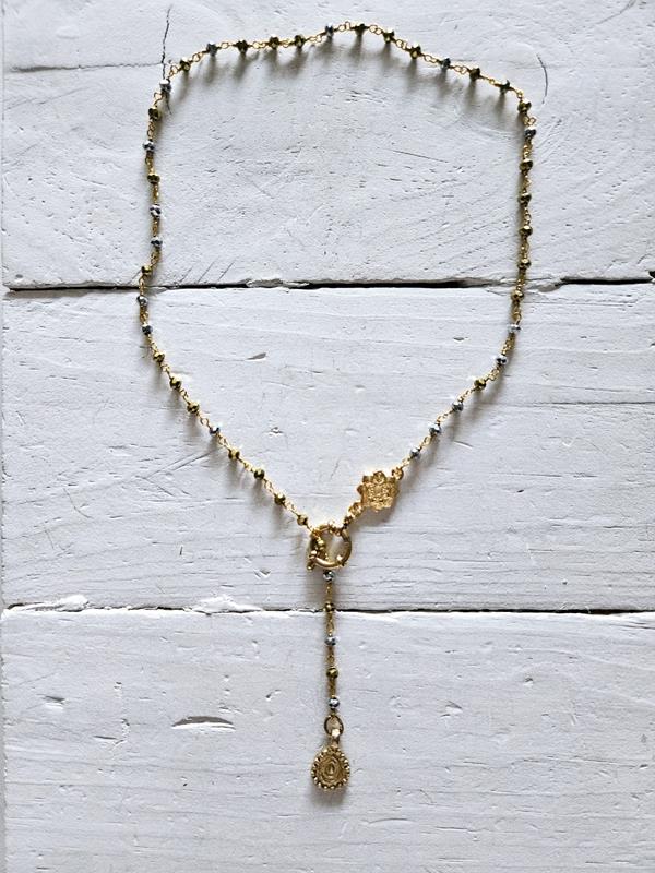 Gargantilla tipo rosario con piedras de cristal facetado en tono irisado, engarzado en dorado, mini colgante étnico en latón y broche de acero.