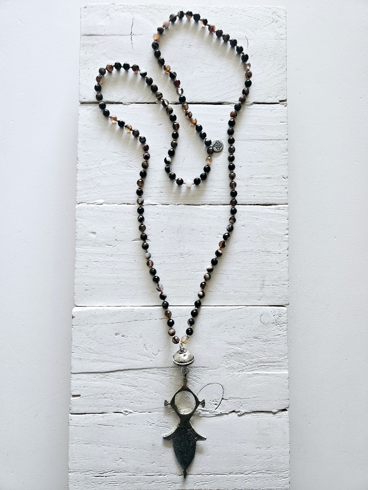 Collar de ágatas facetadas pasadas nudo a nudo en tonos marrones y negro con colgante de cruz tuareg de latón y entrepieza artesana bereber. Tamaño aprox de la cruz 7cm