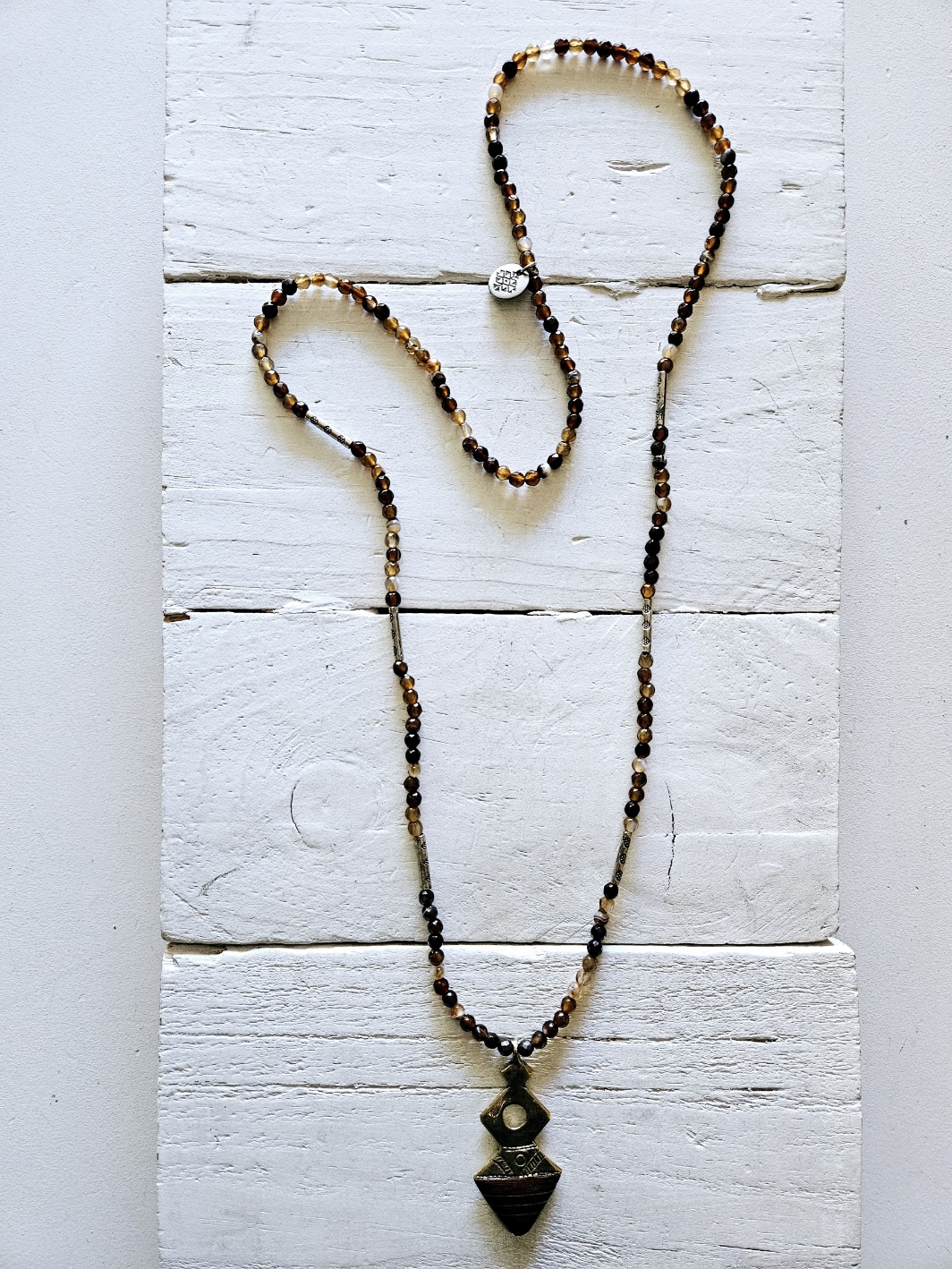 Collar de mini ágatas facetadasen tonos marrones y negro con colgante de pequeña cruz tuareg trabajada con ébano y entrepiezas artesanas. Tamaño aprox de la cruz 3cm