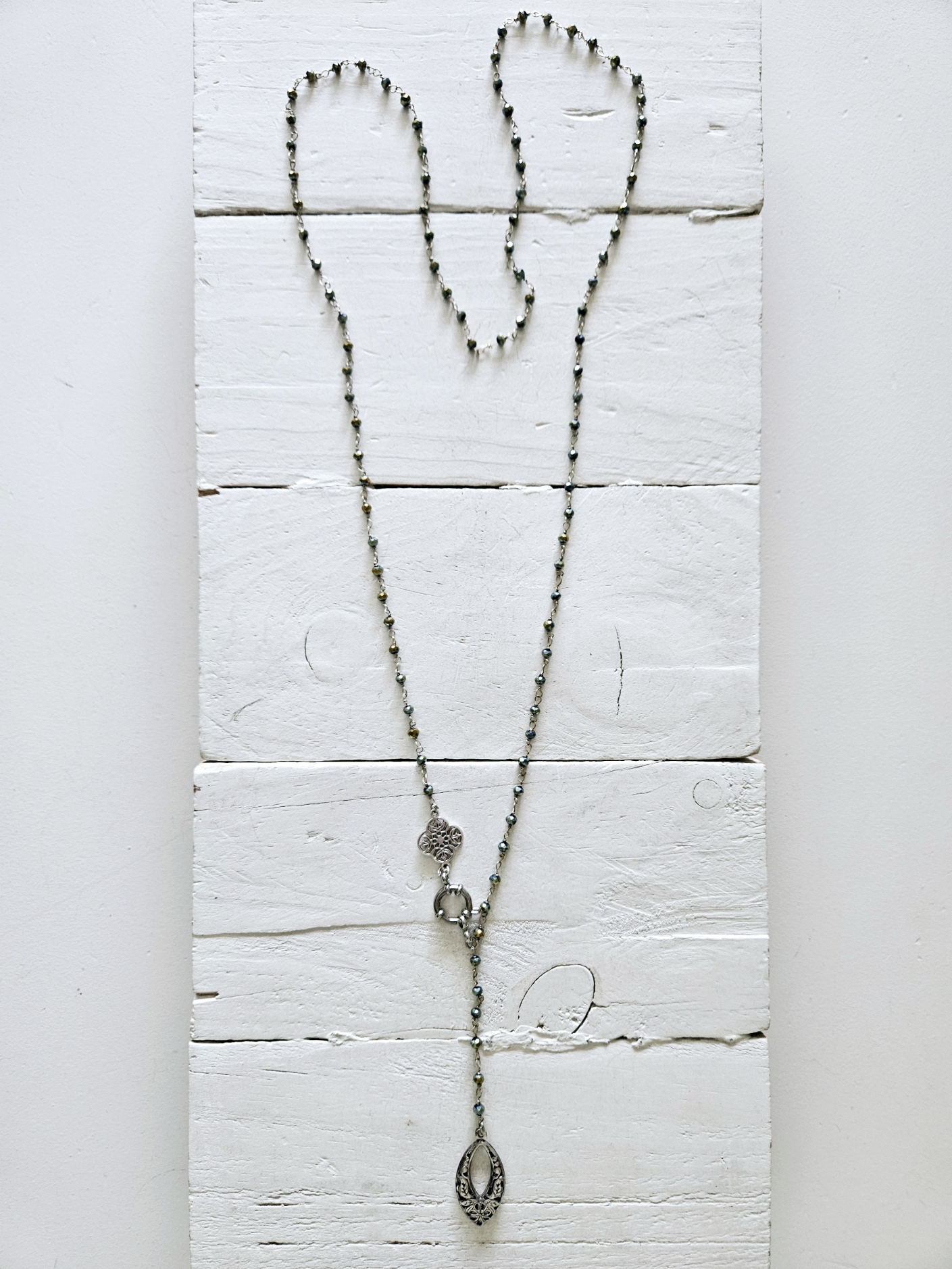 Collar tipo rosario con piedras de cristal facetado en color bronce, colgante vintage y broche de acero. Posibilidad con doble vuelta.