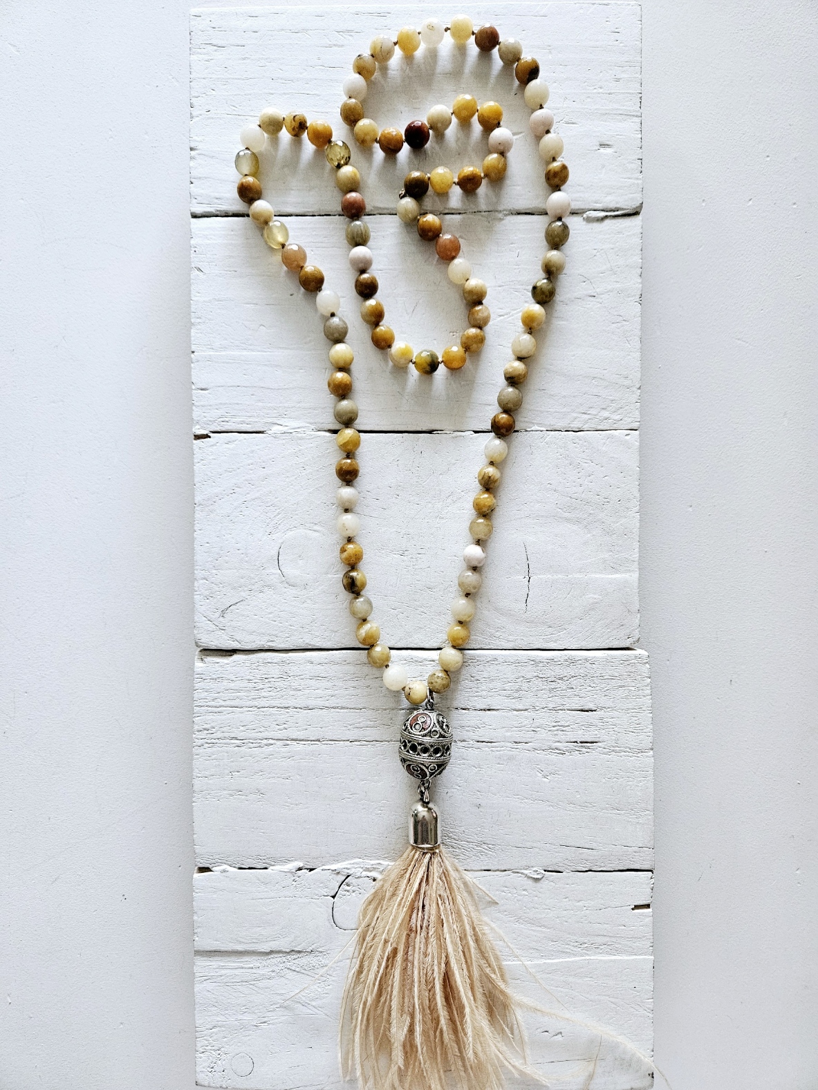 Collar de ágatas en tonalidades arena y verdoso, con pieza bereber y plumas de avestruz a tono. Hecho artesanalmente nudo a nudo. Tamaño de las piedras 1cm.