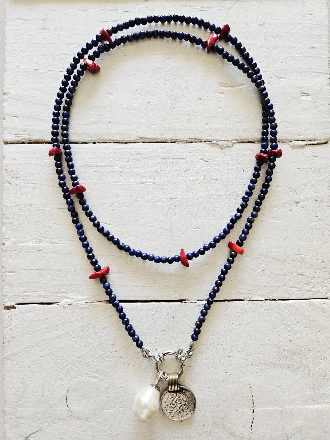 Gargantilla doble vuelta de pequeñas cuentas de lapislázuli con pequeños corales intercalados, broche delantero, moneda de plata afgana y colgante de perla de cristal. Se pueden poner quitar o alternar.