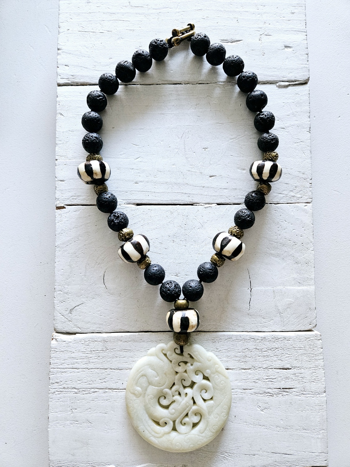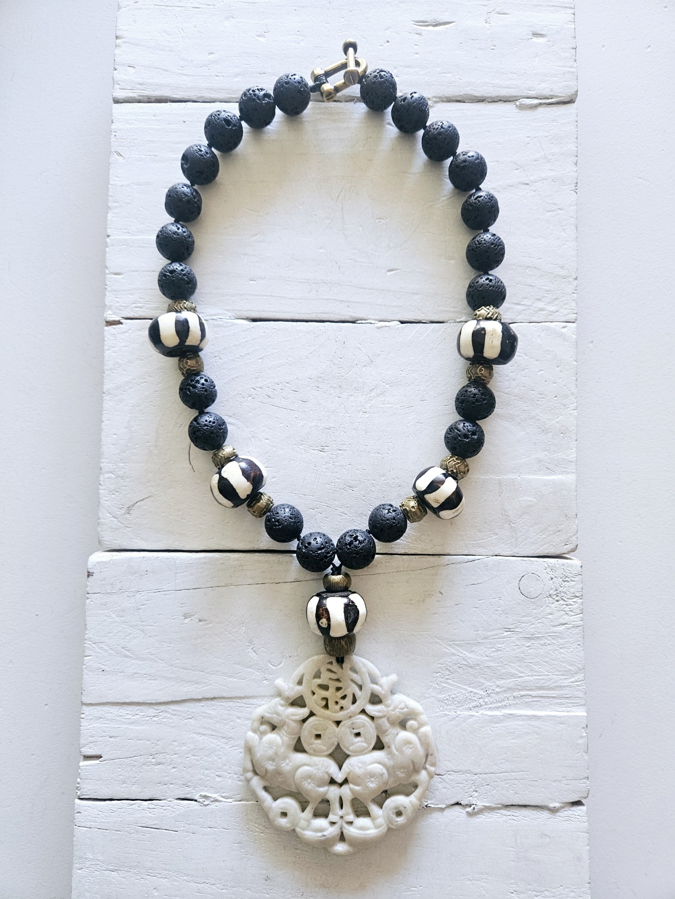 Collar corto de piedra volcánica negra con piezas de hueso africanas y colgante de jade blanco tallado artesanalmente. Tamaño de la pieza 7cm.aprox. Cierre de herradura en latón.