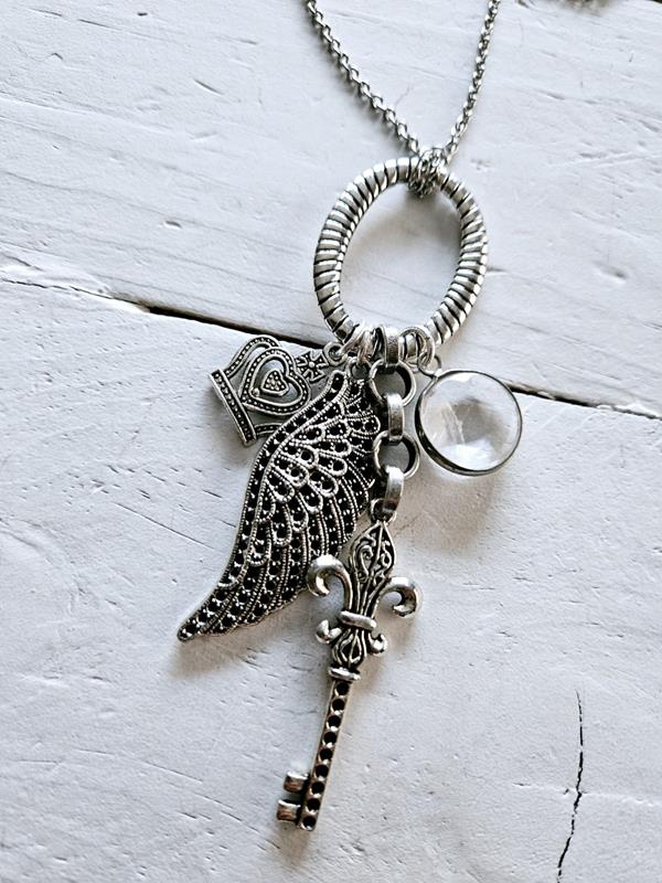 Cadena de acero con aro y colgante de alas y varios charms. Tamaño aprox del colgante 8cm. total
