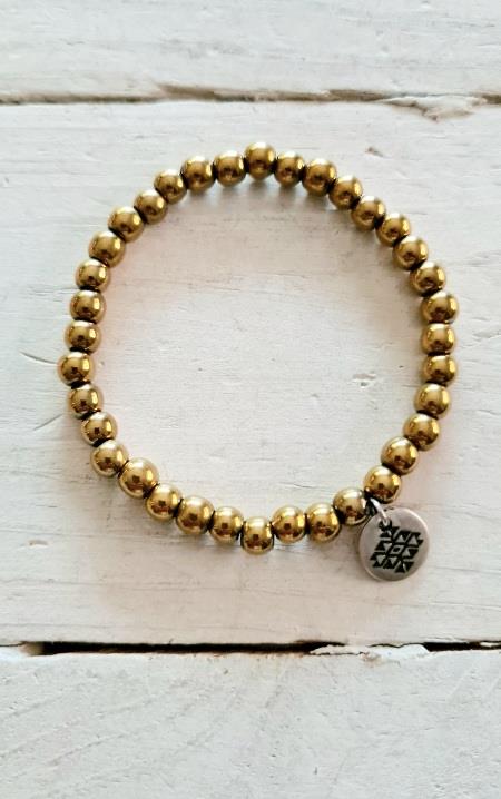 Pulsera elástica de bolitas de hematites en tono dorado, ideal para combinar varias. También en plateado.