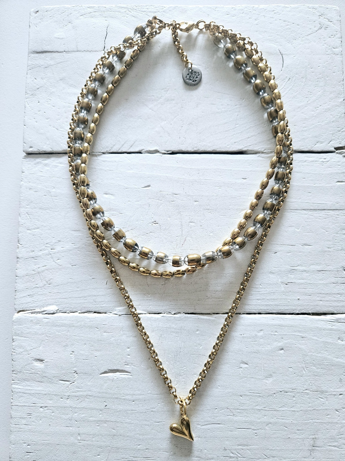 Gargantilla triple con cuentas de cristal checo, hematites ovalados, cadena de acero y colgante de pequeño corazón con baño de oro de 24k, largo ajustable. Tamaño aprox corazón 1,5cm.