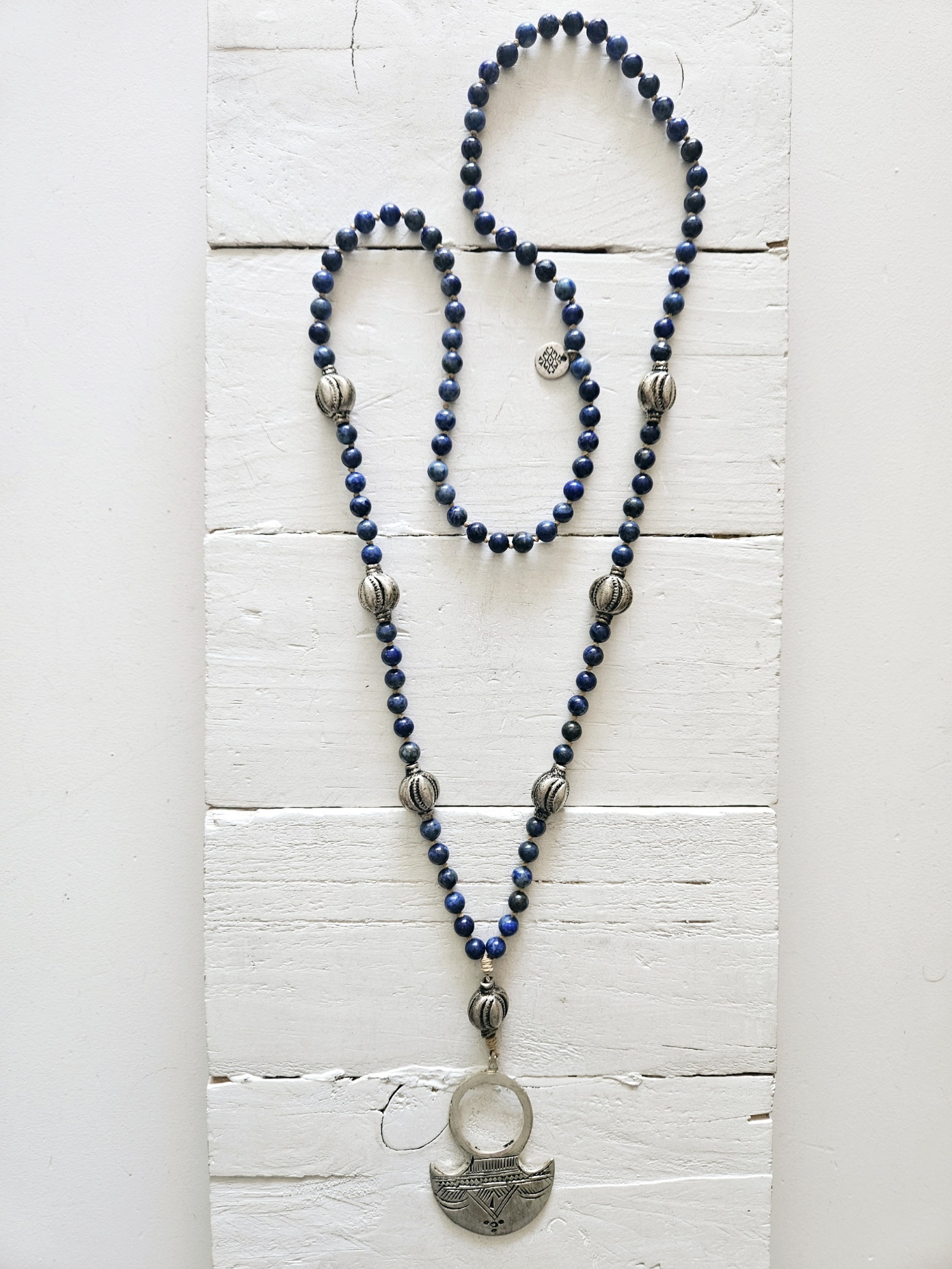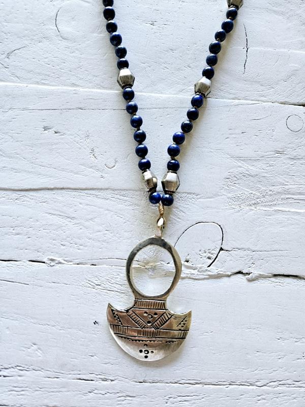Collar de lapislázuli pasado nudo a nudo, con colgante de amuleto auténtico tuareg y entrepiezas artesanas. Tamaño de la pieza 6cm. aprox.