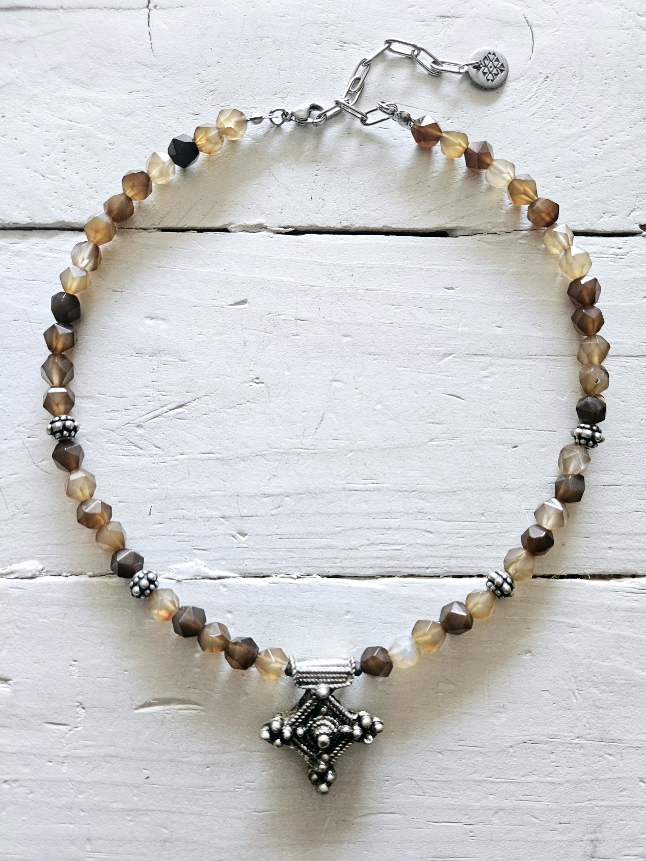 Gargantilla de ágatas facetadas en tonos marrones y colgante de cruz bereber. Tamaño de la cruz aprox. 2cm tamaño de las piedras 4mm. aprox. Largo ajustable con extensor de 5cm.