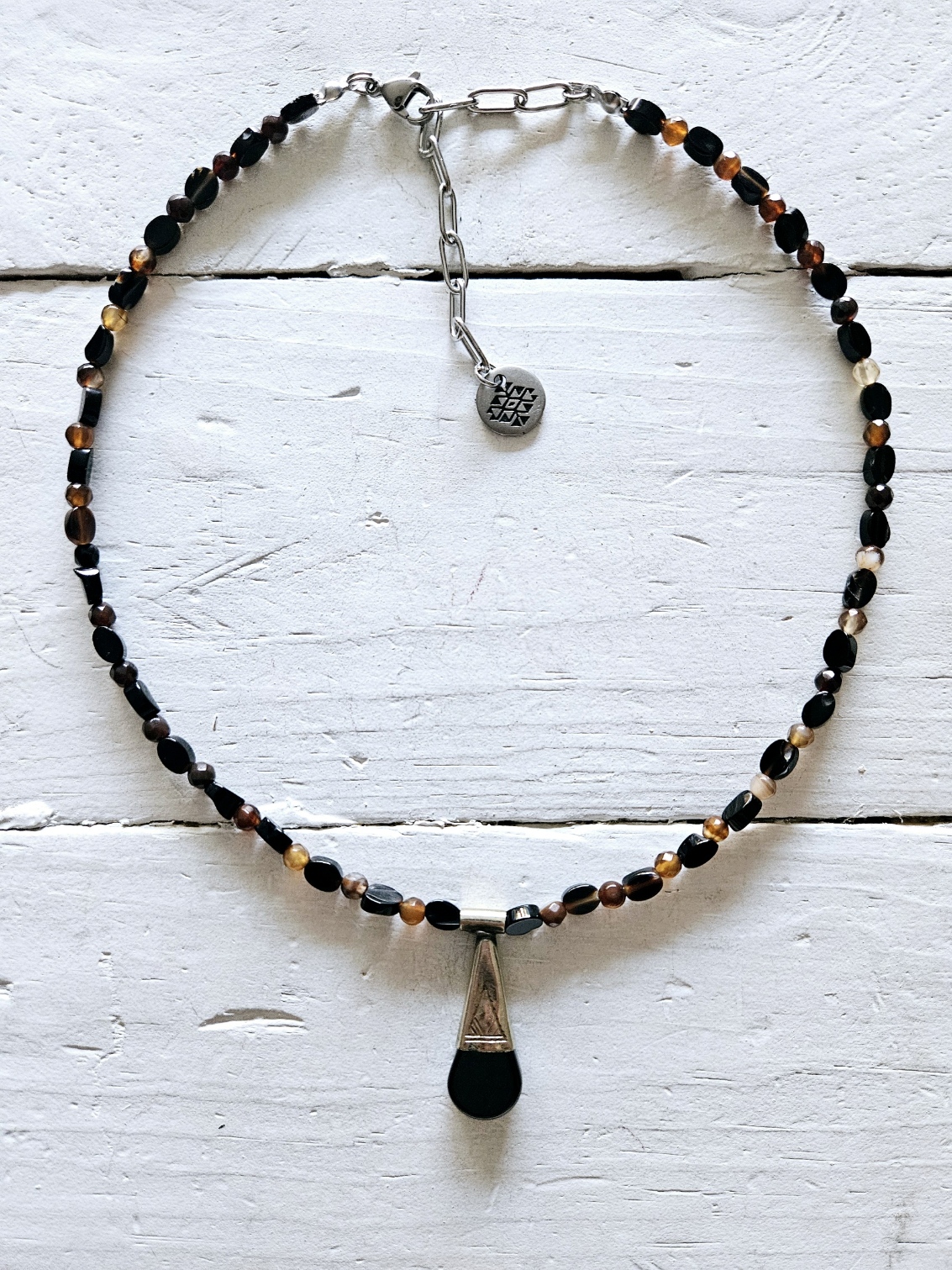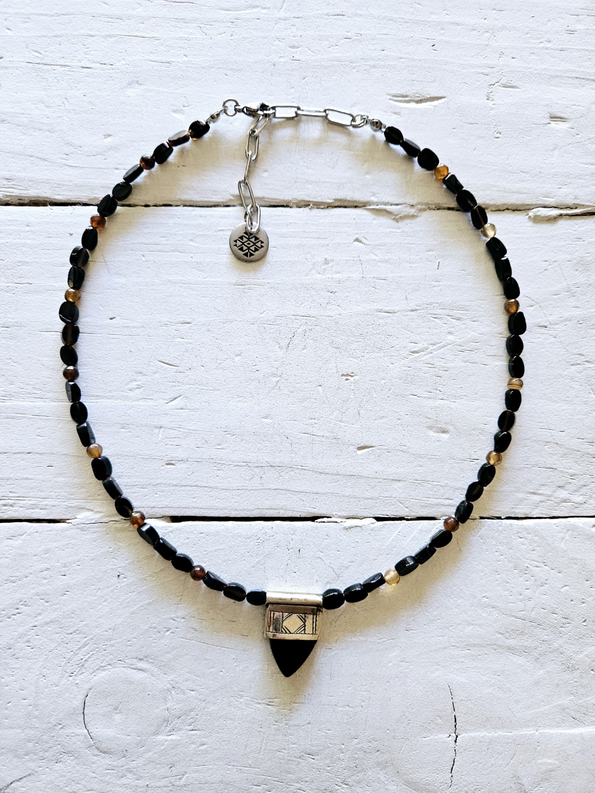 Gargantilla de ágatas facetadas en color negro chispeado de marrón y colgante de mini amuleto bereber. Tamaño del colgante 1,5cm, aprox. tamaño de las piedras 3mm. aprox. Largo ajustable con extensor de 5cm.