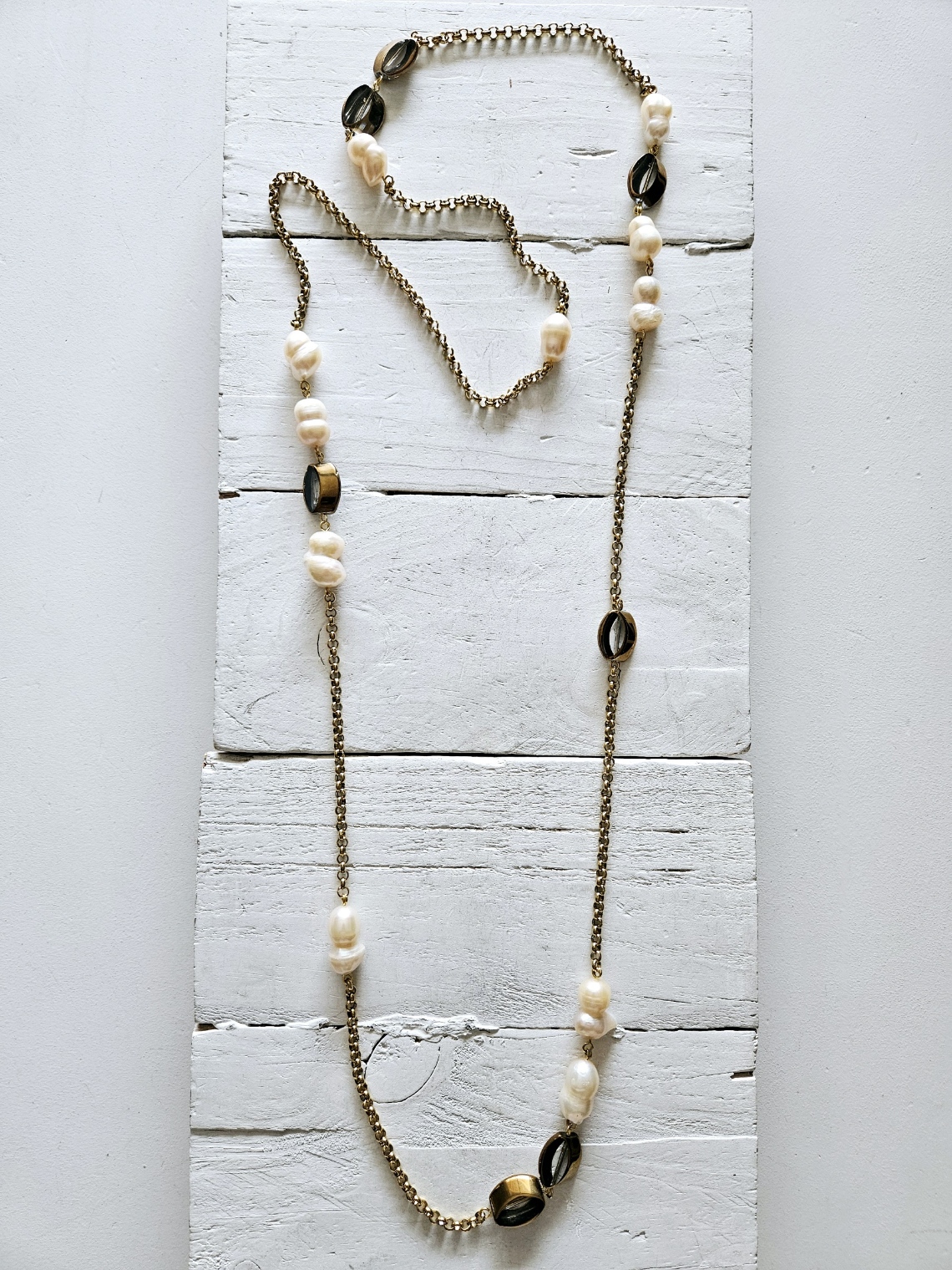 Collar de cadena de eslabones de acero en dorado, perlas y cuentas de cristal ahumado, estilo Chanel, posibilidad de dos vueltas. Largo o con dos vueltas, muy combinable con otras piezas.
