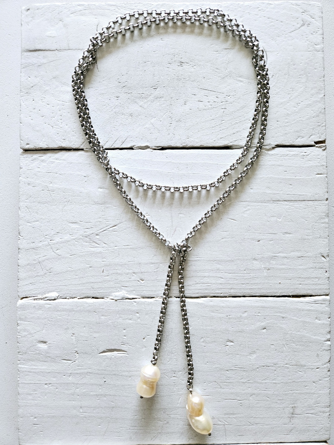 Gargantilla para anudar con cadena de acero en plateado para una o dos vueltas con terminación de dos perlas "cacahuete". Tamaño perlas 2cm. aprox.