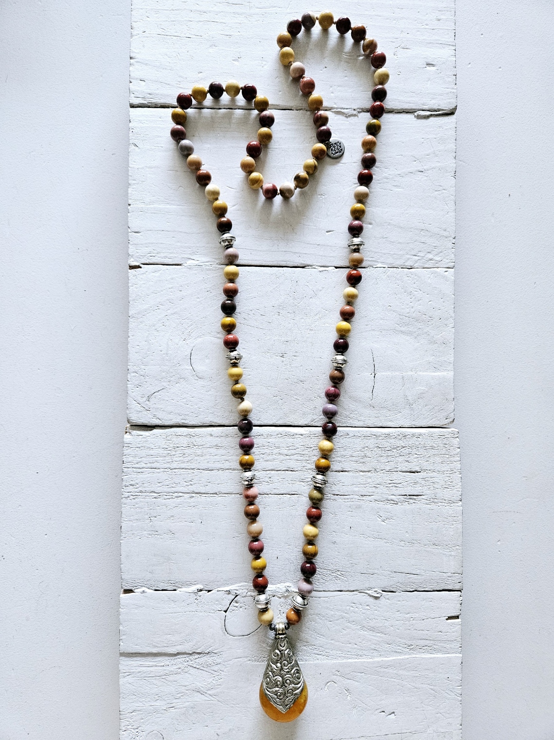 Collar de Jaspe australiano pasado nudo a nudo con colgante de ambar y plata y entrepiezas artesanas. Tamaño piezas 6cm. tamaño cuentas 8mm.